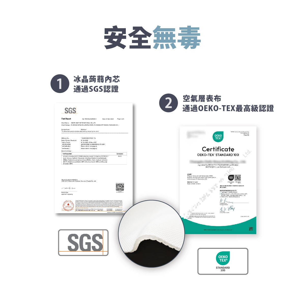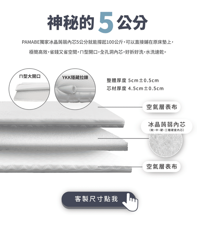 床芯採三段式切割,使用POE環保材質製造,透氣率達95%,比泡棉高出3倍以上